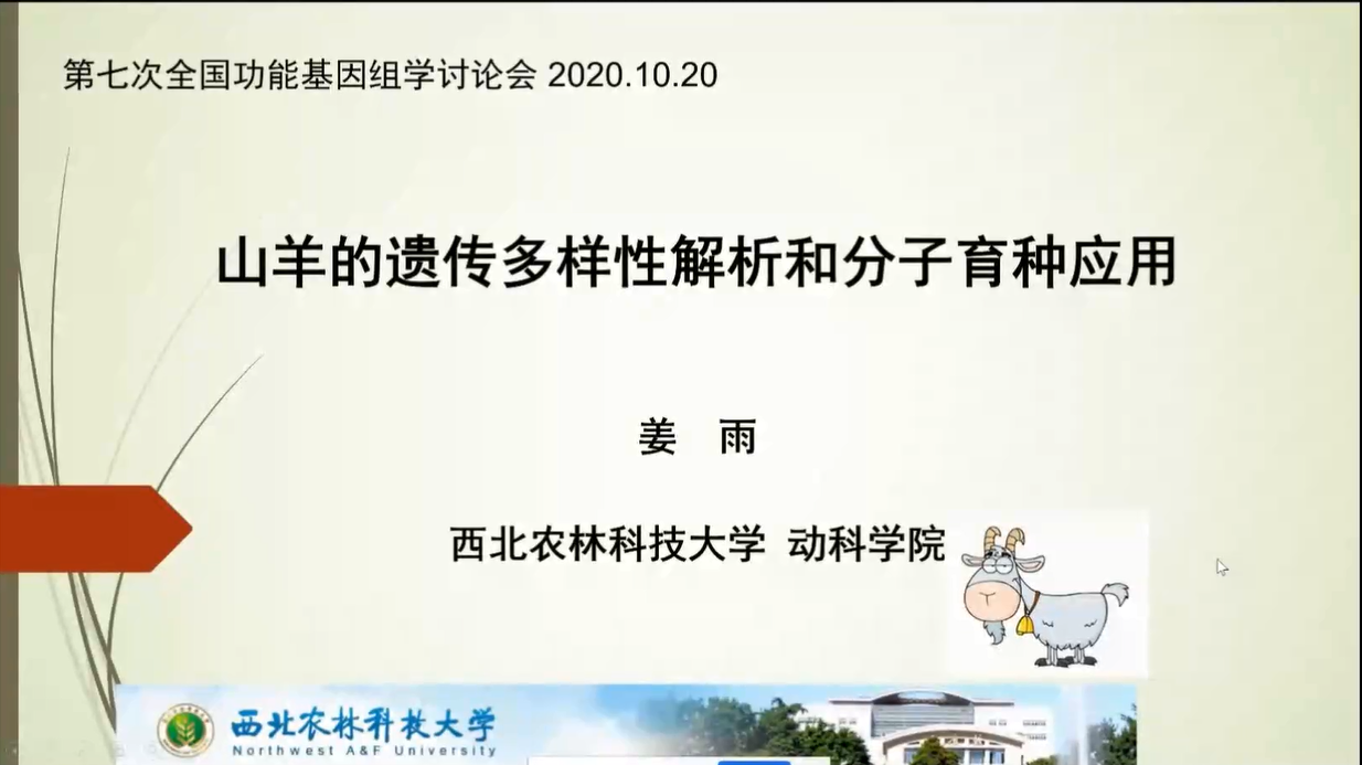 西北農(nóng)林科技大學(xué)姜雨教授風(fēng)趣而系統(tǒng)的解析了世界山羊品種的遺傳來源,并在山羊上鑒定出關(guān)鍵抗病基因MUC6。展示了基于世界主要家畜的SNP和CNV等變異信息和頻率構(gòu)建的家畜遺傳變異數(shù)據(jù)庫。最后表示其研究團(tuán)隊(duì)構(gòu)建了適用于中國綿羊和山羊的基因芯片,將為羊的基因組選擇育種服務(wù),而該芯片也將進(jìn)入分析應(yīng)用階段。姜老師的研究結(jié)果引起了線上基因組學(xué)相關(guān)領(lǐng)域眾多學(xué)者的熱烈討論。