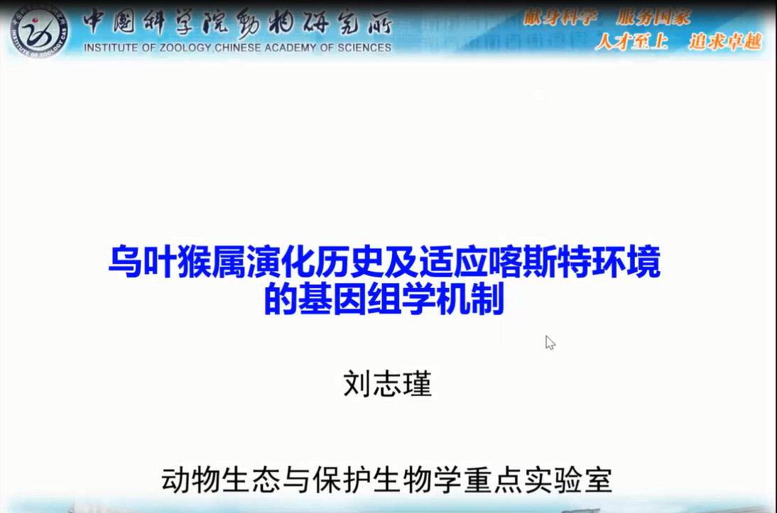 中國科學(xué)院動(dòng)物研究所劉志瑾副研究員詳述了烏葉猴屬中黑葉猴種組、銀葉猴種組、郁烏葉猴種組三個(gè)種組演化地位和種群動(dòng)態(tài)。并對(duì)石山葉猴和雨林葉猴兩大類群以及黑葉猴種組的分化情況進(jìn)行了深入闡述。研究最后推斷EDNRB基因是在自然選擇過程中,在白頭葉猴遺留下來的環(huán)境適應(yīng)性毛色表型的關(guān)鍵機(jī)制。劉老師的報(bào)告使相關(guān)領(lǐng)域?qū)W者對(duì)靈長類生態(tài)分類群中的基因-環(huán)境相互作用和生理-形態(tài)適應(yīng)機(jī)制有了新的認(rèn)識(shí)。