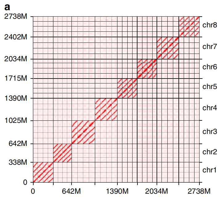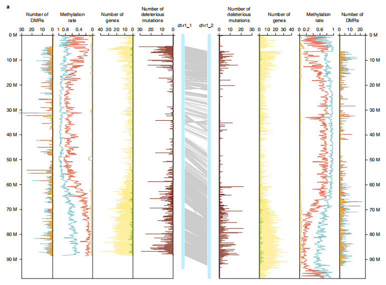 隨著單倍型的解析,不少研究發(fā)現在同源染色體間有大量的變異信息,而這些突變累積很可能引起等位基因的有害/有益替代。從而可以對亞基因組(同源染色體)間基因含量、GC含量、基因結構、重復元件分布等比較、亞基因組間結構變異(倒置、易位),結合TE分布等進行亞基因組(同源染色體)間差異分析。