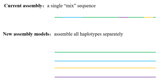同源多倍體是指所有染色體組來源于一個個體的染色體組自我復制或同一個物種內不同個體間的雜交與多倍化。通常二倍體基因組裝出單套基因組,異源四倍體能組裝出兩套基因組。而由于早期的技術限制,同源多倍體物種往往只能組裝1-2套(例如2017年甘薯基因組)。隨著技術的發(fā)展以及研究的深入,研究者發(fā)現僅單套的基因組數據難以完全演示該物種的全面信息。尤其是一些同源多倍體的物種,同源染色體之間不同遺傳位點的組合對生物表型有重要影響,如動植物中的雜種優(yōu)勢、某些物種雜交不育現象等。單倍型等位基因間差異對基因表達、功能及其表型都有著重要影響,大多數雜交品種的優(yōu)勢表型都受等位基因調控。