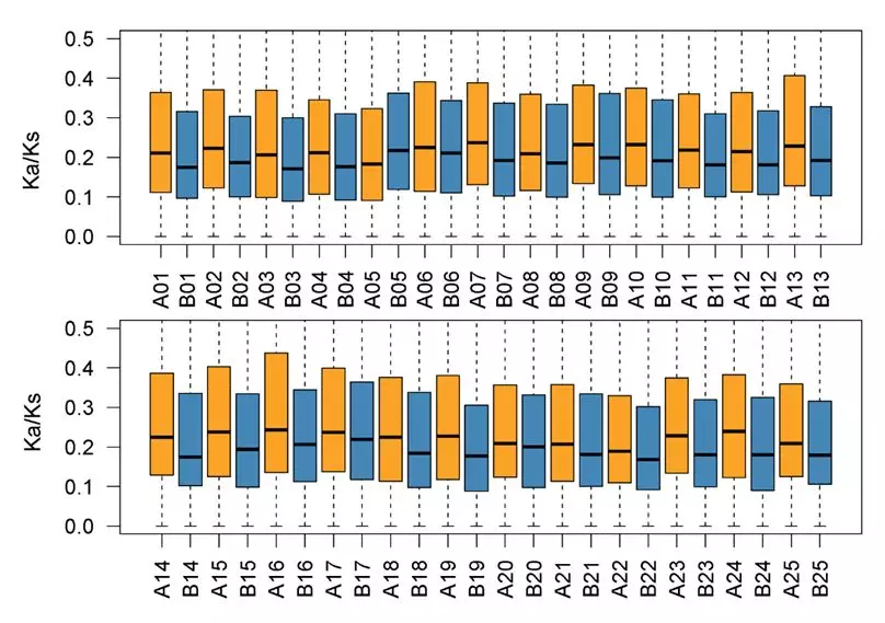 圖9 金魚A、B亞基因組Ka/Ks