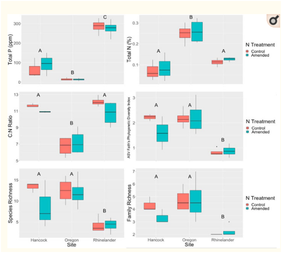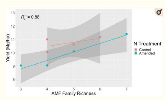 在包括施氮處理在內(nèi)的線性混合效應(yīng)回歸模型中,AMF的?ASV多樣性指標(biāo)不能顯著預(yù)測任何地點(diǎn)的柳枝稷產(chǎn)量。在科水平上,AMF豐富度是俄勒岡地塊產(chǎn)量的邊際顯著預(yù)測因子;俄勒岡地區(qū)AMF群落中科水平的豐富度越高,柳枝稷產(chǎn)量就越高,表明隨著AMF家族的豐富,柳枝稷可能由于AMF功能互補(bǔ)而受益于更大的多樣性。