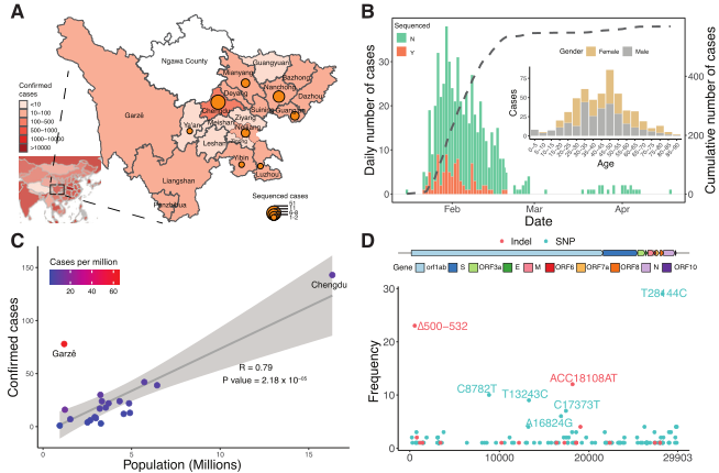 (A)中國四川省COVID-19確診和測序病例的地理分布。已確認(rèn)的病例編號是彩色的,圓圈的大小與排序病例的數(shù)量成比例。(B)四川省COVID-19 pcr確診病例的時間序列。本研究根據(jù)病例是否測序進(jìn)行分類。虛線表示累計病例數(shù)。(C)四川省21個城市確診病例數(shù)與人口規(guī)模的關(guān)系。(D)四川人群SARS-CoV-2基因組中SNP(藍(lán)色)和indel(紅色)的頻率。y軸表示SARS-CoV-2基因組中的位置。