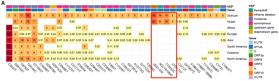 對截至2020年11月9日存放在GISAID上的81391個高質(zhì)量公共基因組序列進(jìn)行分析,其中35個snp中有29個(82.8%)來自其他大洲;一些變異(C3037T、G26144T、C8782T、T28144C、G11083T和C18060T)在歐洲、非洲、大洋洲和美國流行,表明大多數(shù)snp已經(jīng)在世界范圍內(nèi)流行。與武漢人群的比較顯示,四川和武漢都存在另外四種變體,這些復(fù)發(fā)型包括三個Indels:Δ500-532, ACC18108AT和Δ729-737;一個SNP:T13243C(圖2A),表明這些變異可能是從武漢輸入的,與四川患者的旅行記錄一致。