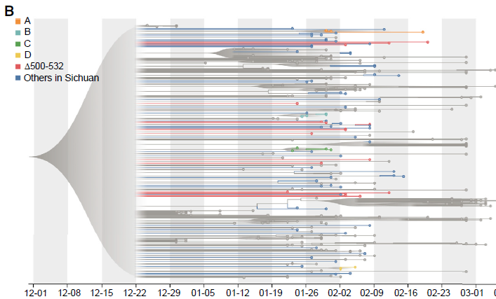 值得注意的是,在Nsp1編碼區(qū)有兩個缺失,Δ500-532和Δ729-737,在四川觀察到23例(26%)和2例(2.2%);在武漢觀察到39例(24%)和4例(3%)。對Δ500-532的基因組進(jìn)行了研究,發(fā)現(xiàn)它在系統(tǒng)發(fā)育樹的不同簇中分布稀疏(圖2B)。結(jié)果表明Δ500-532發(fā)生在多個城市,并可能從武漢多次輸入,這與缺失Δ500-532的四川患者中有83.3%的人有去過武漢的旅行史相一致。