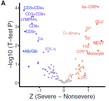 ?圖3A 與COVID-19嚴(yán)重程度相關(guān)的顯著特征的火山圖