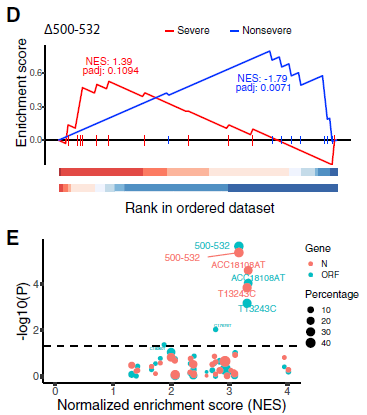 采用類似GSEA的分析方法,來鑒定一個突變體是否富集嚴(yán)重/非嚴(yán)重的臨床表型。發(fā)現(xiàn)Δ500-532與ESR等嚴(yán)重相關(guān)表型呈負(fù)相關(guān)?;谟?沒有某種變異類型,將病例分為兩組,發(fā)現(xiàn)感染Δ500 -532病毒的患者在所有檢測的35種變異中Ct值最高(圖3E)。