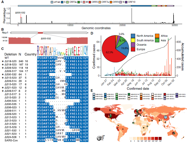 計算了SARS-CoV-2基因組中每個堿基對的缺失頻率,Δ500-532位點(diǎn)是第五大最常見的缺失區(qū)域(圖4A)。測序結(jié)果支持高序列深度的缺失,并通過Sanger測序驗證了缺失(圖4B)。從GISAID的37個國家的922例病例中,在Δ500-532位點(diǎn)找到了24種缺失變異(圖4C)。其中62.5%和19.8%分別來自歐洲和北美(圖4D),主要變種為Δ518-520 (Δ1aa), Δ518-523 (Δ2aa)和Δ509-523(Δ5aa)(圖4E)。因此,研究結(jié)果顯示SARS-CoV-2基因組中存在一個缺失熱點(diǎn),相關(guān)病例數(shù)量在全球范圍內(nèi)穩(wěn)步上升。