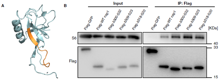 SARS-CoV-2 Nsp1的C端結(jié)構(gòu)域與40S核糖體亞基結(jié)合并干擾mRNA的進(jìn)入,但實驗發(fā)現(xiàn)突變的SARS-CoV-2 Nsp1保留了與40S核糖體亞基的結(jié)合能力(圖5B)。