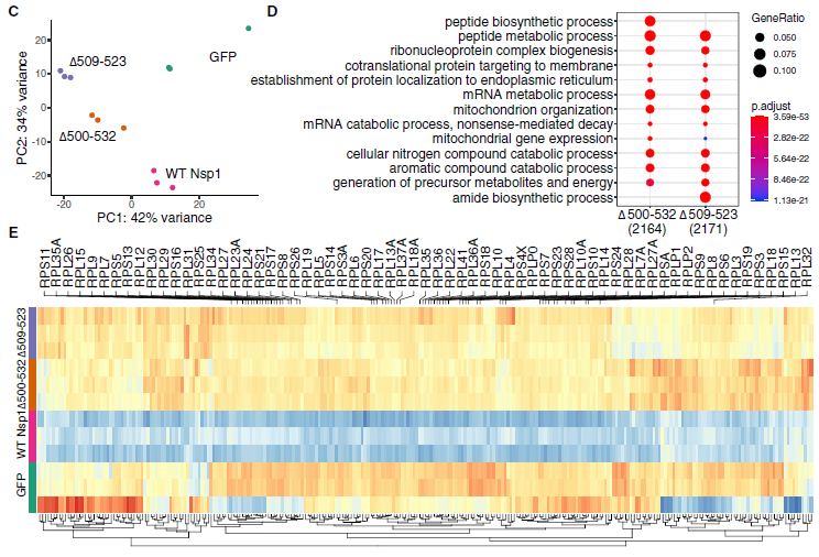 值得注意的是,與GFP對照相比,WT中編碼核糖體蛋白(RPs)的mRNA代謝過程通路中的許多基因下調(diào)。相比之下,有兩個缺失組表現(xiàn)出不同于WT更類似于GFP對照的表達(dá)模式(圖5E)。這些結(jié)果表明,Nsp1中這些N端缺失可能影響其在mRNA和蛋白質(zhì)代謝過程中的功能