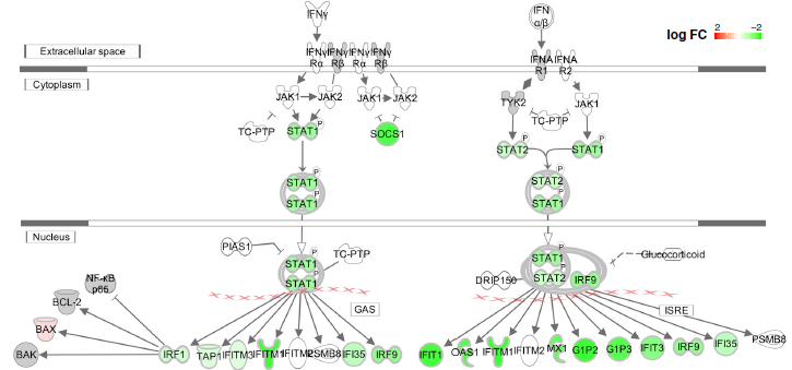 圖6G 與表達(dá)WT Nsp1的A549細(xì)胞相比,Δ500-532突變體中干擾素信號通路顯著下調(diào)(綠色表示下調(diào),紅色表示上調(diào))