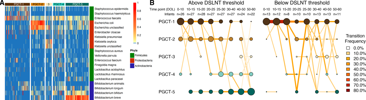 采用種水平數(shù)據(jù)對(duì)PGCTs進(jìn)行DMM聚類,5種PCGTs最理想(圖4A)。PGCT-1特征菌是高豐度Staphylococcus?spp和Enterococcus faecalis,PGCT-2高豐度Escherichia?spp,PGCT-3高豐度Klebsiella?spp,PGCT-4和PGCT-5高豐度Bifidobacterium?spp,B. breve在PGCT-5豐度高。根據(jù)樣本在所有時(shí)間點(diǎn)和clusters上的分布,在出生后前70天內(nèi)接受MOM中DSLNT高于和低于241nmol/ml的嬰兒微生物組差異顯著(圖4B)。在校正組間抽樣頻率不均勻后,最后一個(gè)時(shí)間點(diǎn)接受MOM超過(guò)DSLNT閾值2倍的嬰兒類似于PGCT-5,其Bifidobacterium高豐度(圖4A)。