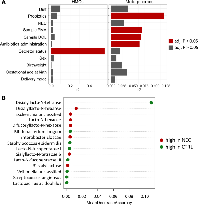 結(jié)果:相比對(duì)照組,NEC患兒母親母乳中HMO和DSLNT濃度顯著降低。MOM閾值為241nmol/ml對(duì)NEC的敏感性和特異性為0.9。NEC發(fā)病前的宏基因組測(cè)序顯示,NEC患兒Bifidobacterium longum相對(duì)豐度降低,Enterobacter cloacae相對(duì)豐度升高。低MOM DSLNT影響微生物組的縱向發(fā)展,這與過(guò)渡到以雙歧桿菌為主的早產(chǎn)兒腸道菌群類型的減少有關(guān),通常在年齡大一些的嬰兒中觀察到。疾病前HMO和宏基因組數(shù)據(jù)結(jié)合隨機(jī)森林分析區(qū)分嬰兒健康或是NEC準(zhǔn)確度為87.5%。