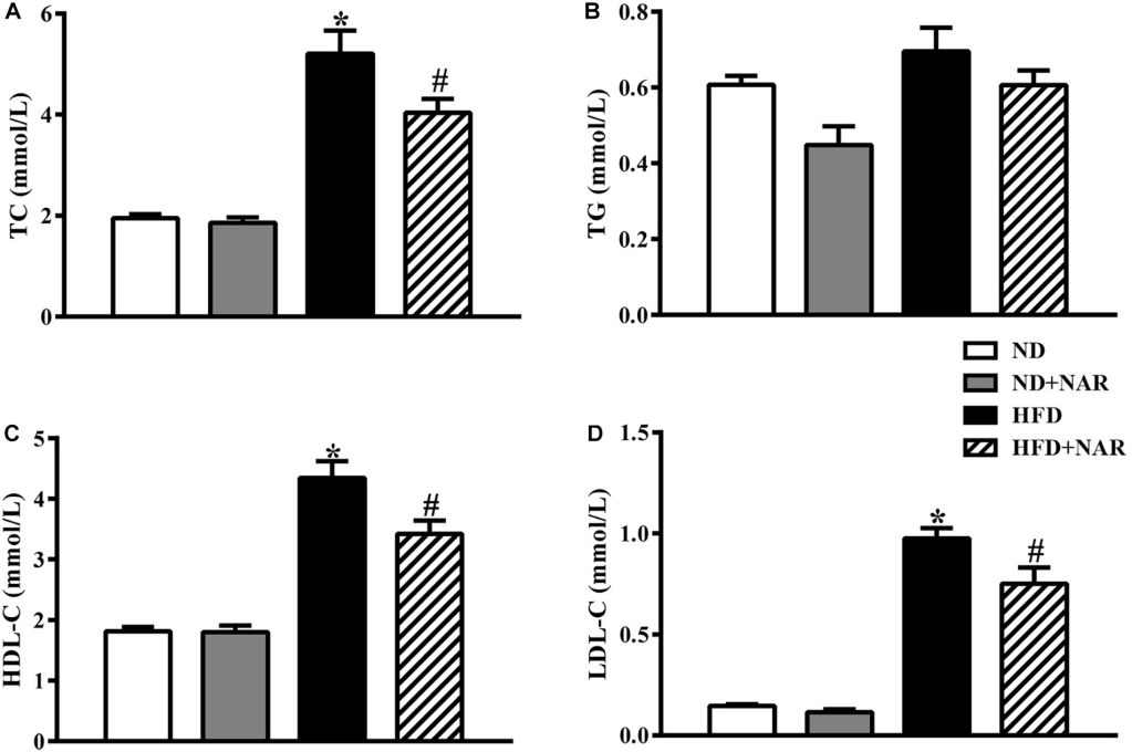 圖2為四組小鼠血脂結(jié)果。與對照相比,HFD組小鼠TC、HDL-C和LDL-C水平升高,提示HFD組血脂代謝異常。補充NAR可以預(yù)防HFD引起的高血脂,四組間血清TG水平差異不顯著。