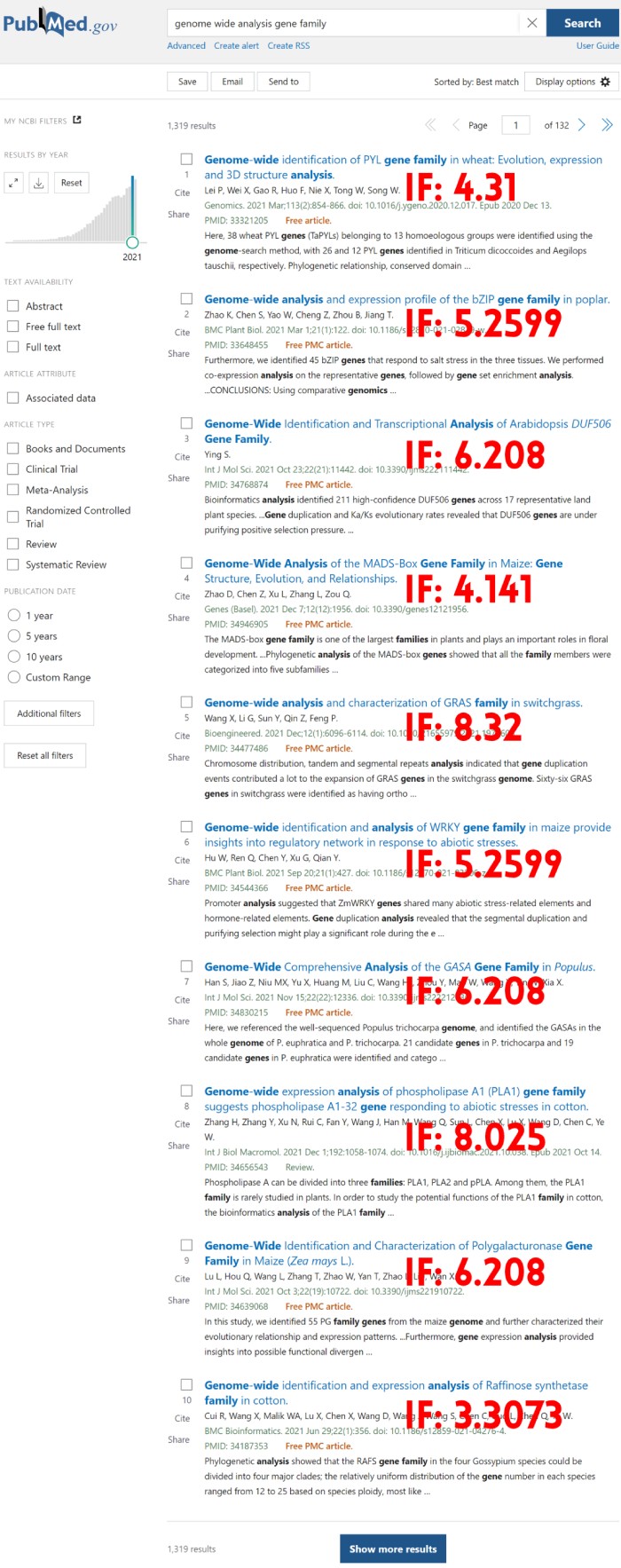 我們統(tǒng)計(jì)在2021年發(fā)表了1319篇相關(guān)的基因家族文章,而2022年到目前已經(jīng)發(fā)表了1241篇(使用genome wide of gene family關(guān)鍵詞檢索)??梢钥吹交蚣易逦恼逻@種套路文章發(fā)文之大。且如果進(jìn)化做的好,可以分析一個(gè)基因家族在多個(gè)物種中演化規(guī)律,即可發(fā)更高水平的文章。