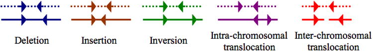 高通量測(cè)序數(shù)據(jù)除了可以分析SNP/InDel位點(diǎn)外,還可以利用雙端測(cè)序的中的插入片段長(zhǎng)度信息和比對(duì)時(shí)出現(xiàn)的異常比對(duì)結(jié)果,對(duì)測(cè)序樣本中可能存在的結(jié)構(gòu)變異進(jìn)行分析。本次課程主要利用BreakDancer這款軟件進(jìn)行結(jié)構(gòu)變異位點(diǎn)的分析,軟件主要預(yù)測(cè)了五種類型的結(jié)構(gòu)變異:插入、缺失、倒位、染色體間和染色體內(nèi)易位,