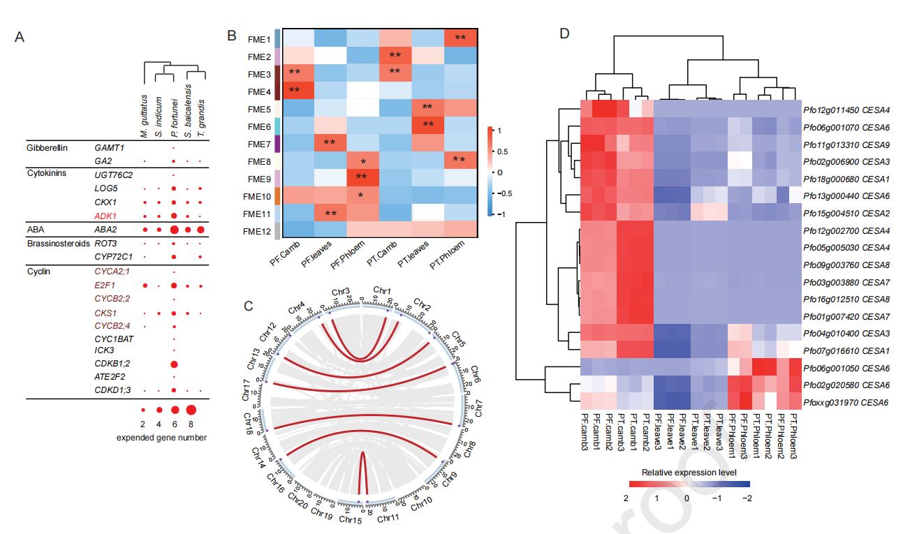 植物的形態(tài)發(fā)生和生長速率可能歸因于細胞增殖和分裂、細胞壁形成以及光合效率或其他生物過程的增強。細胞分裂素生物合成中的四個基因家族和細胞周期調(diào)控中的十個基因家族,通過串聯(lián)基因復(fù)制或最近的WGD發(fā)生顯著擴增(圖2A)。在泡桐屬植物中,白花泡桐(PF)的生長速度遠遠快于毛泡桐(P. tomentosa?PT)。約85%的毛泡桐基因cDNA可定位于白花泡桐基因組,因此對白花泡桐和毛泡桐的葉片、樹干韌皮部和樹干形成層進行了比較轉(zhuǎn)錄組學(xué)分析。WGCNA分析得到12個潛在快速生長相關(guān)ME(FME1~12),F(xiàn)ME3與毛泡桐和白花泡桐形成層的生長發(fā)育相關(guān)(圖2B)。FME3模塊包括42個參與植物激素途徑或參與細胞周期調(diào)控的基因。FME4僅在白花泡桐中與形成層生長和發(fā)育高度相關(guān)(圖2B),這個模塊中有五個基因與激素信號有關(guān),其中包括參與細胞分裂素代謝的腺苷激酶1,且這些基因在白花泡桐中顯著擴增。通過基因的表達及拷貝數(shù)分析表明,CESAs、Csls和木質(zhì)素生物合成基因可能在白花泡桐的發(fā)生中起作用(圖2D)。