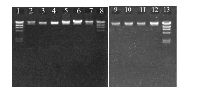 大鼠肺;Lane 6:小鼠脾臟;Lane 7:小鼠肝臟;Lane 8:Marker;Lane 9:果蠅;Lane 10:東亞飛蝗;Lane 11:石斑魚(yú);Lane 12:白條地藤壺;Lane 13:λ-Hind Ⅲ DNA Marker。