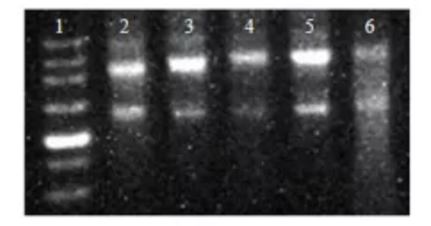 Lane 1:250 bp DNA Marker ;Lane 2:小鼠/子宮;Lane 3:小鼠/肺;Lane 4:小鼠胃;Lane 5:小鼠/心臟;Lane 6:果蠅。