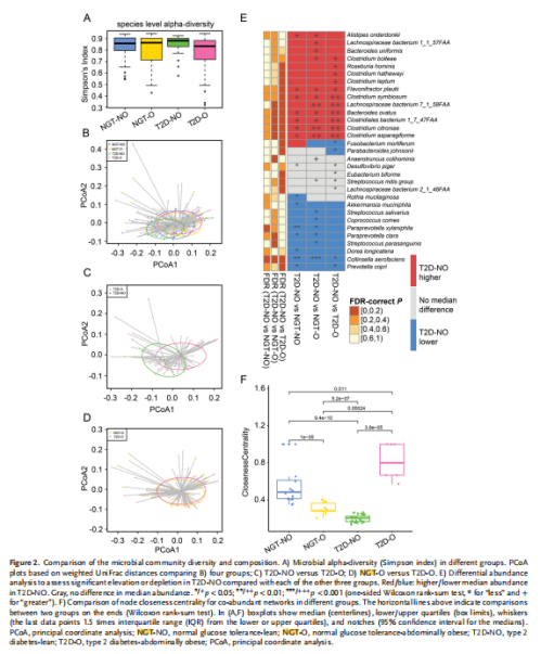 1、四組中不同的腸道微生物組特征在我們的健康人群和新診斷出的?T2D腹部肥胖人群中,擬桿菌、厚壁菌門和變形菌門是所有組中主要的門。這些門占腸道微生物組成的?96%?以上,其他細(xì)菌的豐度要低得多(平均低于?4%)。與其他三組相比,T2D-NO組厚壁菌門的相對(duì)豐度較高(30%),擬桿菌門的豐度較低(62%)。然而,在四組之間在門水平上沒(méi)有觀察到顯著差異(例如,厚壁菌門?p = 0.17,擬桿菌門?p = 0.31,Kruskal-Wallis?檢驗(yàn))。在分類分析后?,對(duì)四組間的多樣性進(jìn)行了比較。結(jié)果顯示盡管所有四組中的細(xì)菌集高度相似,但與其他三組相比,T2D-NO 組的豐度分布異于其他。更具體地說(shuō),在?T2D-NO?和?T2D-O?組(p = 0.012,PERMANOVA)(圖?2C)和?T2D-NO?和?NGT-O?組(p = 0.03,PERMANOVA)中差異顯著。NGT-NO?和?T2D-NO?組之間存在分離趨勢(shì),但差異并不顯著(p = 0.108,PERMANOVA)。從?PCoA?中發(fā)現(xiàn)?NGT-O?和?T2D-O?組具有高度相似的整體腸道微生物群落特征(圖?2D)(p = 0.918,PERMANOVA)。在物種差異分析中發(fā)現(xiàn),盡管T2D-NO?和?NGT-NO?對(duì)照組沒(méi)有表現(xiàn)出顯著的群落水平差異,但發(fā)現(xiàn)兩個(gè)組之間的個(gè)體物種差異豐富(圖?2E),例如Akkermansia muciniphila ,Paraprevotella xylaniphila, Ruminococcaceae bacterium和Prevotella copri,,表明?T2D-NO?和?NGT-NO?組的特征在于某些微生物,而不是整個(gè)群落的巨大變化。4組的菌群共生網(wǎng)絡(luò)分析顯示NGT-O?網(wǎng)絡(luò)比?NGT-NO?對(duì)照組更小、更簡(jiǎn)單,但比T2D-O?組更復(fù)雜(圖?2F)。對(duì)4組中菌群功能比較發(fā)現(xiàn),T2D-NO?個(gè)體的微生物群可能具有較低的碳水化合物利用能力和較高的BCAAs(支鏈氨基酸)?生產(chǎn)能力。此外,與?NGT-NO?微生物組相比,參與碳水化合物代謝(包括“半乳糖降解”)的?KEGG?模塊在?T2D-NO?中高度富集。