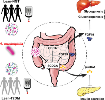 該研究比較了患有和不患有T2D的瘦人和腹部肥胖者的腸道微生物組,以確定腸道微生物組的差異是否能解釋患有T2D的瘦人的具體臨床特征。通過(guò)宏基因組學(xué)和代謝組學(xué)分析,發(fā)現(xiàn)在體型偏瘦的2型糖尿病患者中,腸道中A. muciniphila的豐度顯著下降,其豐度與膽汁酸βCDCA水平成負(fù)相關(guān),與該人群的胰島素分泌受損以及FGF19水平的下降密切相關(guān)。進(jìn)而發(fā)現(xiàn),βCDCA能抑制胰島素分泌和FGF15/19表達(dá)。在高糖飲食誘導(dǎo)的胰島功能受損小鼠腸道中,A. muciniphila豐度顯著降低,而在補(bǔ)充A. muciniphila后,小鼠的胰島功能顯著改善,進(jìn)一步研究發(fā)現(xiàn)A. muciniphila干預(yù)后βCDCA水平降低,腸道FGF15/19的表達(dá)上調(diào),肝糖原合成增加而糖異生減少。本研究提示A. muciniphila干預(yù)可能成為改善胰島素分泌和維持糖穩(wěn)態(tài)的潛在途徑,為2型糖尿病的治療提供了新方向。