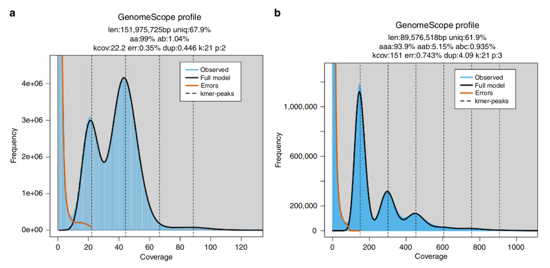 一個(gè)物種基因組組裝質(zhì)量的好壞,其中一個(gè)重要指標(biāo)就是看組裝的大小是否符合這個(gè)物種的預(yù)估值。偏大可能是存在冗余,需要進(jìn)行片段取舍;若偏小,可能是組裝的片段缺失;無(wú)論哪種都不利于后續(xù)基因組的應(yīng)用。而預(yù)估物種基因組大小的主流方法有兩種:①流式細(xì)胞儀測(cè)定DNA含量;②基于測(cè)序片段統(tǒng)計(jì)計(jì)算基因組大小,也就是Survey調(diào)研圖分析。survey以二代測(cè)序技術(shù)為基礎(chǔ),基于小片段文庫(kù)進(jìn)行低深度測(cè)序,通過(guò)K-mer分析,快速獲得基因組大小、雜合度、重復(fù)序列比例等基本信息。為制定該物種的全基因組de novo測(cè)序策略提供有效依據(jù)。原理詳見往期介紹:什么是基因組Survey?為什么要做基因組Survey?