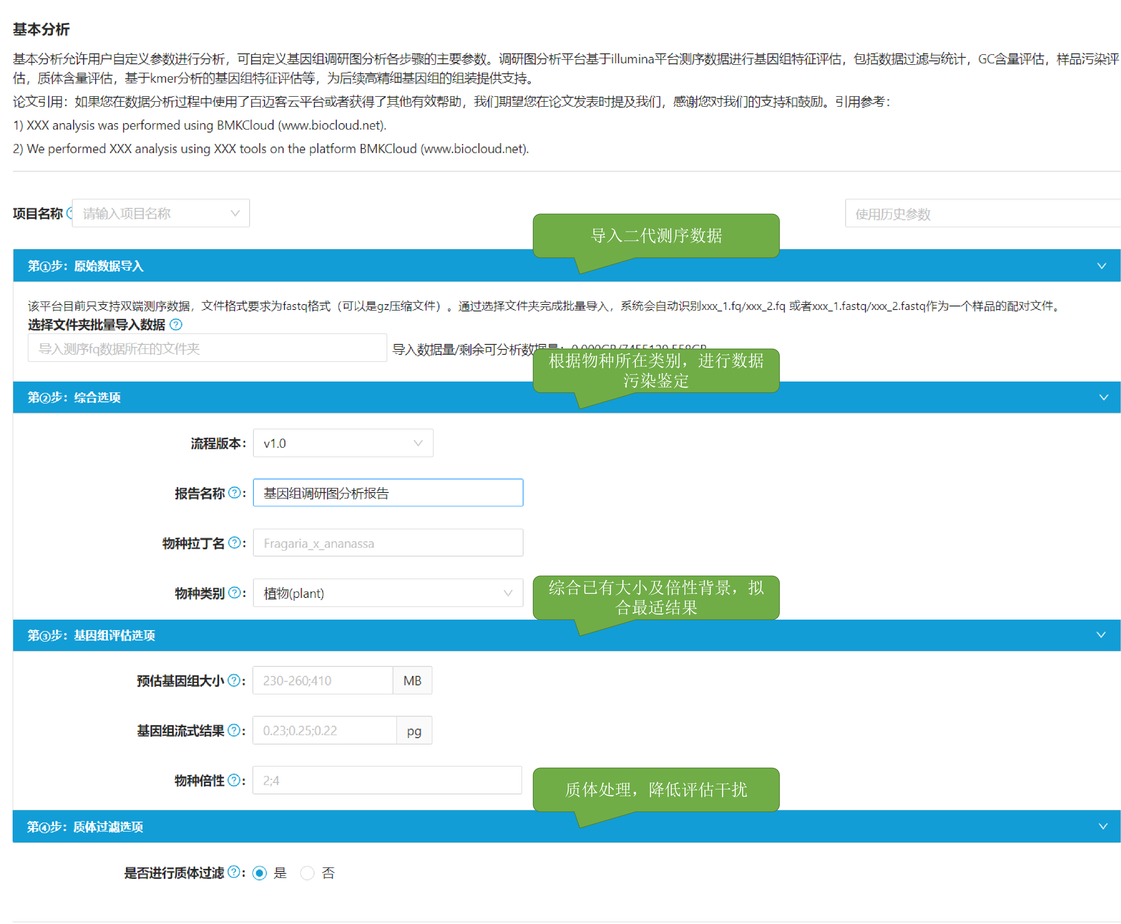 b.為了更好區(qū)分所分析項(xiàng)目,可自主填寫報(bào)告名稱和物種拉丁名(選填)。動(dòng)植物材料選取過(guò)程中易受到微生物或其他生物污染,因此通過(guò)選擇分析物種所在類別,進(jìn)行應(yīng)數(shù)據(jù)庫(kù)比對(duì)判斷污染情況。物種污染程度為材料可用性提供重要依據(jù)。