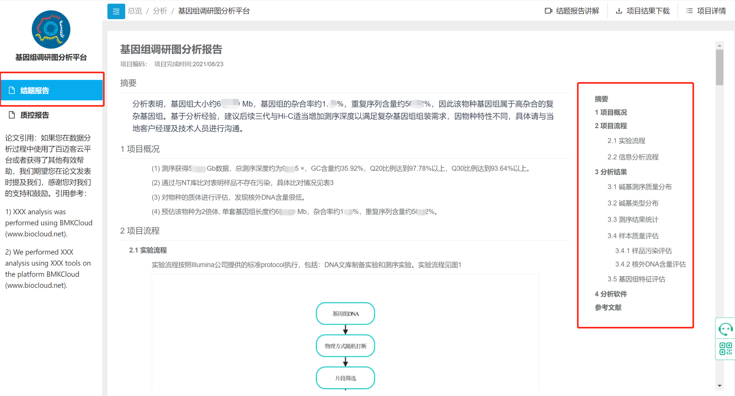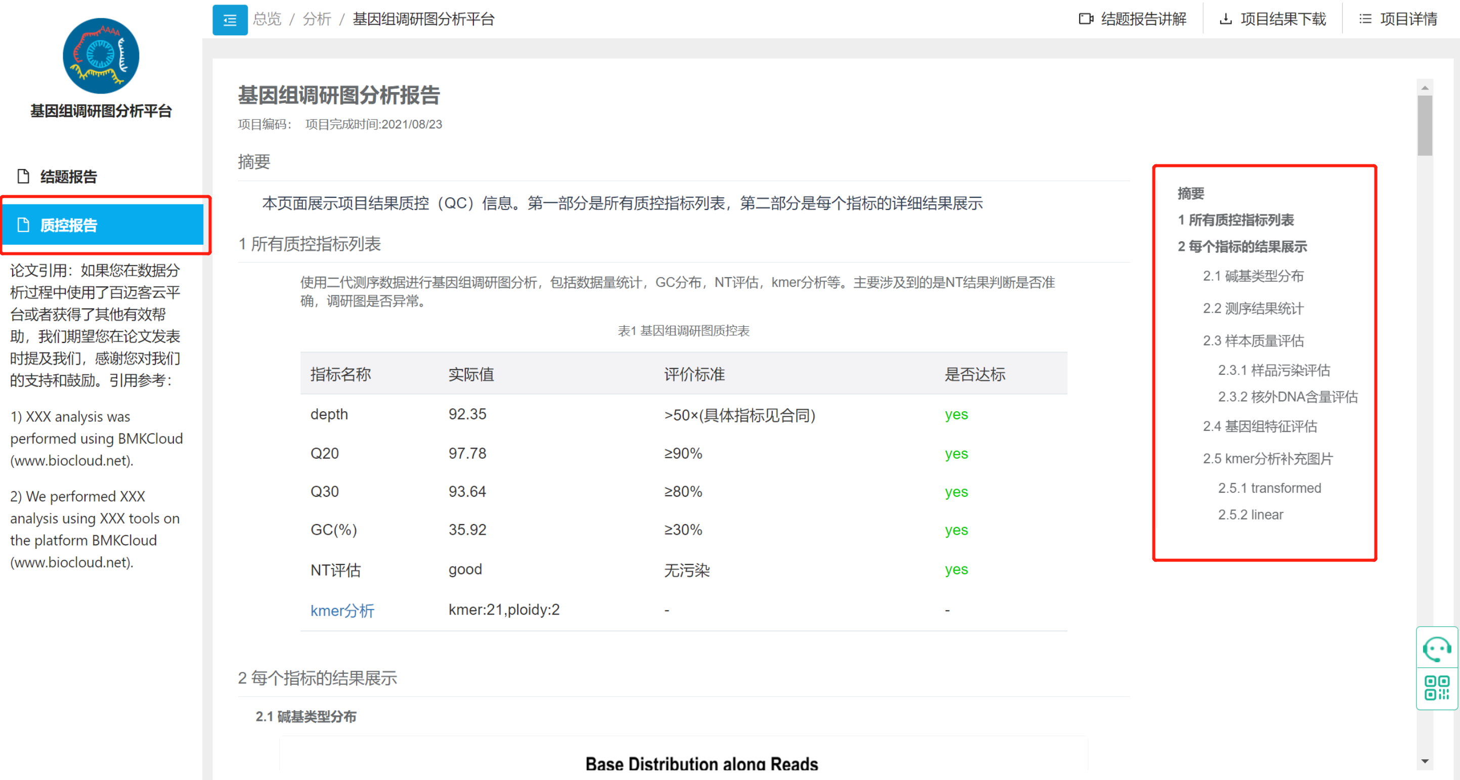 分析完成即可在線查看項(xiàng)目結(jié)題報(bào)告與數(shù)據(jù)質(zhì)控報(bào)告。報(bào)告將對(duì)整體數(shù)據(jù)質(zhì)量、污染評(píng)估、基因組特征、使用軟件版本等進(jìn)行詳細(xì)描述。具體可見下圖右部目錄。