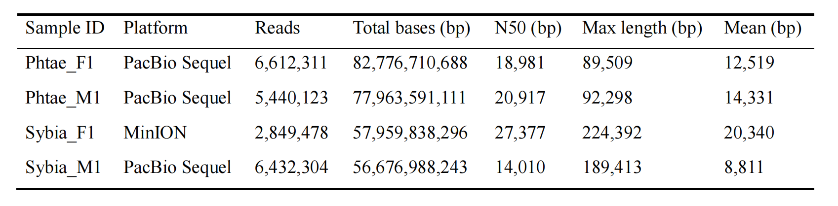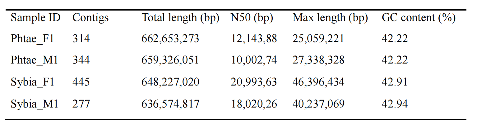 Denovo:雌性、雄性草海龍與雄性綠海龍PacBio平臺(tái);雌性綠海龍Nanopore平臺(tái),雌性、雄性草海龍與雄性綠海龍進(jìn)行Hi-C測(cè)序。三代測(cè)序技術(shù)對(duì)應(yīng)測(cè)序數(shù)據(jù)如下表所示: