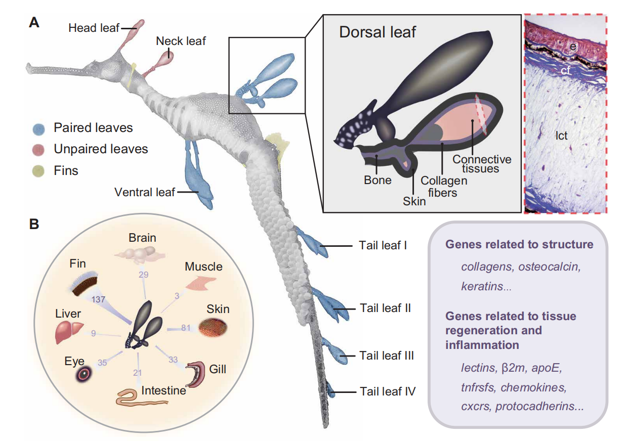 草海龍的頭部、頸部、腹部、背部和尾部區(qū)域有葉子狀的附屬物,可以與周?chē)h(huán)境相融合,使草海龍以完美擬態(tài)隱匿于海草床中。這些結(jié)構(gòu)是該物種的一種適應(yīng)性進(jìn)化產(chǎn)物,主要由骨基質(zhì)和富含膠原纖維的結(jié)締組織組成。通過(guò)轉(zhuǎn)錄組學(xué)分析,發(fā)現(xiàn)其表達(dá)基因(如msx, dlx, fgf)主要從皮膚和鰭等器官募集而來(lái),暗示了相關(guān)基因?qū)π缕鞴佼a(chǎn)生和維持的重要作用。而“附葉”與鰭相比缺乏肢體發(fā)育特異性的hox基因。草海龍的附葉在捕食者的襲擊中經(jīng)常受到損傷,為了研究相關(guān)機(jī)制,作者通過(guò)轉(zhuǎn)錄組分析研究發(fā)現(xiàn)在其附葉中炎癥和損傷修復(fù)相關(guān)基因表現(xiàn)出高表達(dá)水平,說(shuō)明這些基因可能與其附葉的快速愈合和再生能力相關(guān)。同時(shí)草海龍?zhí)禺愋詳U(kuò)張的MHC I基因也在附葉中顯著高表達(dá),能為其提供額外的免疫保護(hù)。