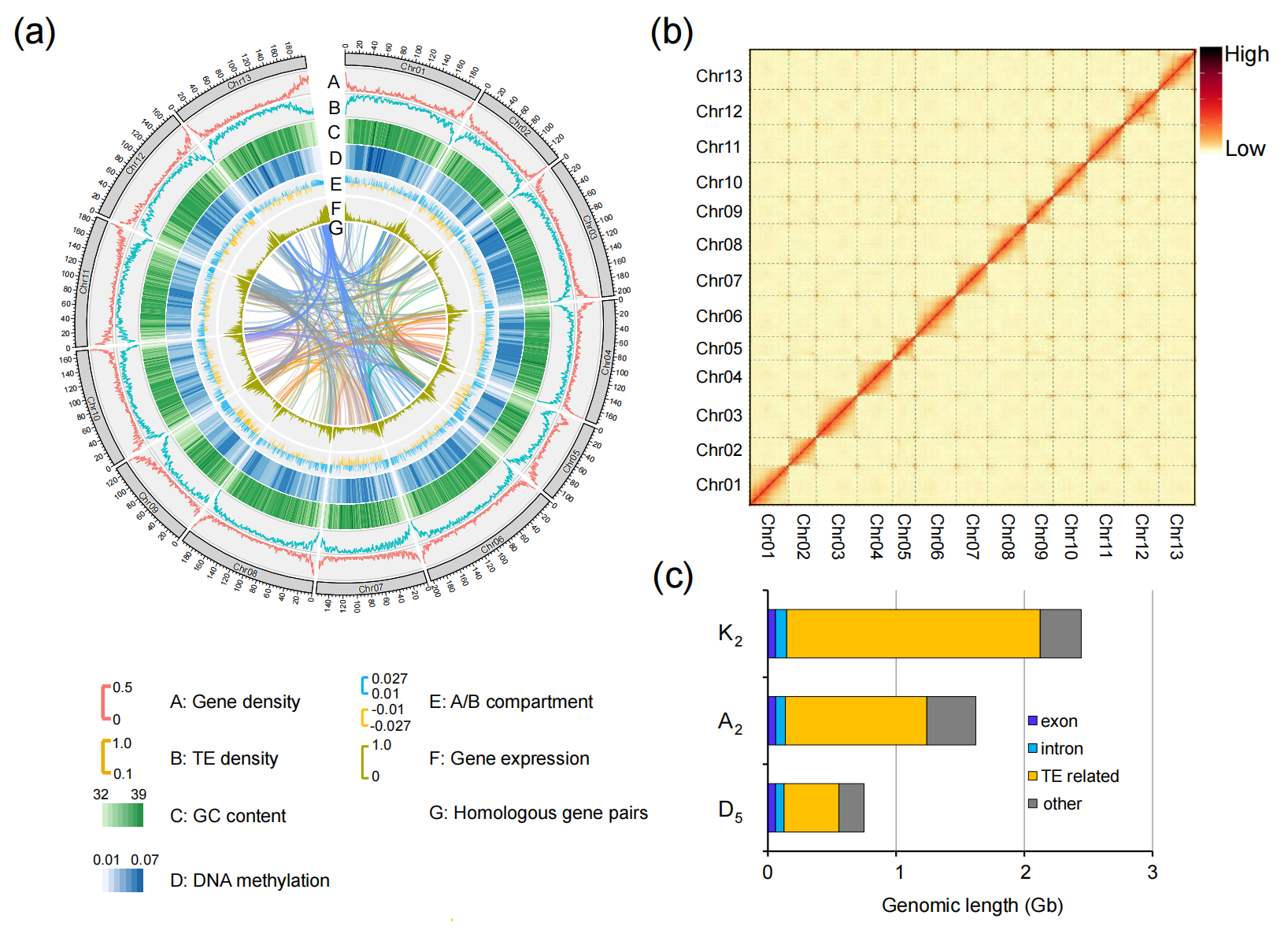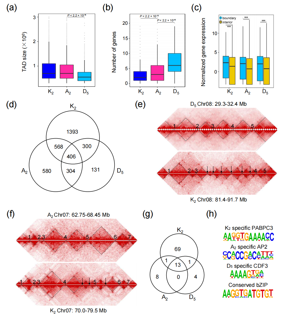 通過(guò)HiC染色質(zhì)互作數(shù)據(jù)揭示三個(gè)棉種染色體大小的規(guī)律,A2與K2比D5多了約7000個(gè)基因,三個(gè)基因組中17%的共線(xiàn)性同源基因表現(xiàn)為A/B區(qū)室的染色質(zhì)狀態(tài)改變,這與活躍的轉(zhuǎn)座子擴(kuò)增相關(guān)。