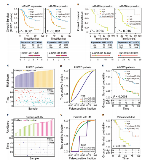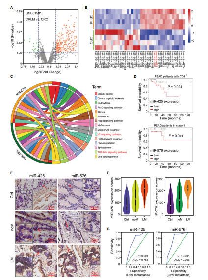 為了驗(yàn)證這兩種miRNA的差異表達(dá),作者收集了157例CRC患者癌組織及癌旁組織。TMA和ISH試驗(yàn)顯示,與對照相比miR-425和miR-576在CRC患者中高表達(dá)尤其是肝轉(zhuǎn)移患者(圖1E和F)。ROC曲線計(jì)算miR-425和miR-576基于肝轉(zhuǎn)移及其他相關(guān)危險(xiǎn)因素線下面積,初步確定其在CRLM中的可信診斷能力(圖1G)。