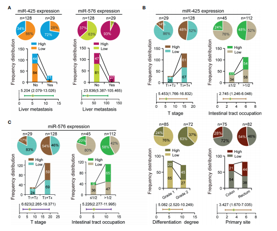 為了探討miR-425和miR-576在CRLM患者中的臨床價(jià)值,作者分析了miR-425和miR-576與環(huán)境因素或病理變量包括年齡、性別、家族史、T分期、樣本量、腸道占位、分化、血管浸潤、原發(fā)部位和肝轉(zhuǎn)移。頻率分布和校正后的回歸分析顯示,miR-425和miR-576高表達(dá)均在肝轉(zhuǎn)移患者組織中頻繁分布(圖2A)。此外,miR-425過表達(dá)與CRC患者晚期T期、腸道占位、分化程度和原發(fā)性直腸相關(guān)(圖2B)。增加miRNA的表達(dá)是滲透到漿膜和廣泛占用腸道的一個(gè)促進(jìn)因素(圖2C)。