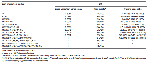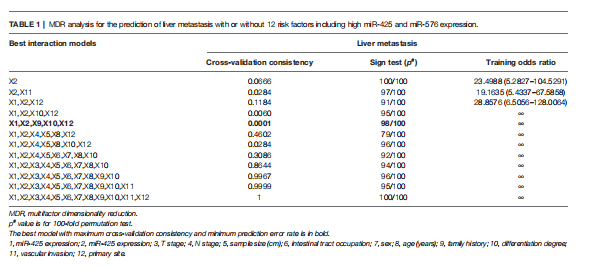 MDR分析顯示,miR-425、miR-576與家族病史、分化程度、原發(fā)部位聯(lián)合使用是評估肝轉(zhuǎn)移風(fēng)險(xiǎn)的最佳預(yù)測模型,其交叉驗(yàn)證一致性(CVC)最高,預(yù)測誤差最小(表1)。這些結(jié)果提示miR-425和miR-576高水平的CRC患者特別容易發(fā)生肝轉(zhuǎn)移。