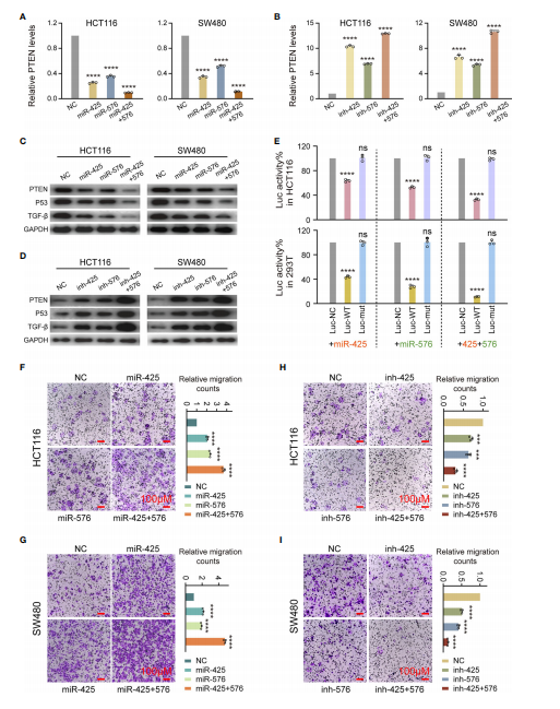 接下來,作者證明了miR-425和miR-576通過負(fù)調(diào)控PTEN-P53/TGF-β軸,在細(xì)胞學(xué)水平上通過敲低和過表達(dá)功能實(shí)驗(yàn)確定了其誘導(dǎo)CRC轉(zhuǎn)移的發(fā)生。QPCR檢測發(fā)現(xiàn),在HCT116和SW480細(xì)胞系中,這兩種miRNA的過表達(dá)均導(dǎo)致PTEN mRNA表達(dá)明顯抑制(圖5A)。MiR-425和miR-576的缺失顯著增強(qiáng)了PTEN mRNA的表達(dá)(圖5B)。WB試驗(yàn)證實(shí)PTEN蛋白的變化一致,P53和TGF-β也是如此(圖5C和D)。正如預(yù)期的那樣,結(jié)果顯示miR-425和miR-576顯著抑制WT熒光素酶基因表達(dá)強(qiáng)度,然而在Mut基因上沒有觀察到明顯的變化表明PTEN 3’UTR與miR-425和miR-576之間存在直接的結(jié)合模式(圖5E)。此外miR-425和miR-576的高表達(dá)顯著促進(jìn)了HCT116和SW480細(xì)胞的遷移能力分,反之亦然(圖5F-I)。綜上所述,miR-425和miR-576直接靶向PTEN介導(dǎo)的P53/TGF-β信號通路,參與了CRLM過程中細(xì)胞遷移的促進(jìn)。