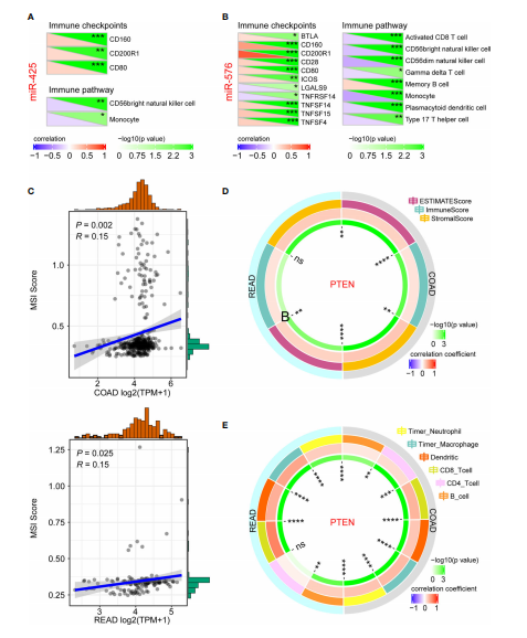 為了進(jìn)一步研究miR-425和miR-576在CRLM發(fā)生和發(fā)育的免疫調(diào)節(jié)中的重要作用,作者首先分析了miR-425和miR-576與相關(guān)指標(biāo)的相關(guān)性。因此,miR-425在CRC進(jìn)展中與免疫檢測點(diǎn)密切相關(guān),如CD160、CD200R1和CD80及免疫通路包括CD65自然殺傷細(xì)胞和單核細(xì)胞(圖6A)。MiR-425與檢測點(diǎn)和通路存在顯著相關(guān)性(圖6B)。此外,作者進(jìn)一步發(fā)現(xiàn)腫瘤抑制因子PTEN與MSI、TME、免疫細(xì)胞浸潤呈正相關(guān),從免疫的角度闡明了PTEN對CRLM的調(diào)控作用(圖6C-E)。以上結(jié)果表明,miR-425/ miR-576介導(dǎo)的PTEN抑制通過觸發(fā)免疫逃逸促進(jìn)CRLM過程。
