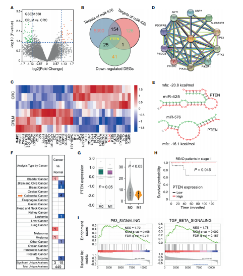 為了闡明miR-425和miR-576介導(dǎo)肝轉(zhuǎn)移和不良預(yù)后的有意義的下游靶點(diǎn),作者在GSE81558 (n = 6)數(shù)據(jù)集上繪制火山圖,分析CRC組織和癌旁組織之間的DEGs(圖4A)。PTEN是CRLM中顯著下調(diào)基因與miR-425和miR-576靶基因的交集(圖4B)。聚類熱圖顯示在CRLM中PTEN的下調(diào)最顯著(圖4C)。進(jìn)一步檢索STRING發(fā)現(xiàn)與PTEN互作的關(guān)鍵蛋白(圖4D)。配對序列間的有效MFEs分別為?20.8和?16.1 kcal/mol(圖4E)。進(jìn)一步分析發(fā)現(xiàn),基于TCGA數(shù)據(jù)庫PTEN在幾種類型的腫瘤中表達(dá)顯著下調(diào)(圖4F),PTEN表達(dá)越低易發(fā)生腫瘤轉(zhuǎn)移且預(yù)后越差(圖4G和H)。此外,基于GSE62321 (n = 26)數(shù)據(jù)集,PTEN與miR-425和miR-576一致,證實(shí)PTEN正向參與P53、TGF-β信號通路,在腫瘤轉(zhuǎn)移中發(fā)揮有意義的作用(圖4I)。這些結(jié)果表明,PTEN下調(diào)是CRLM中miR-425和miR-576的共同靶點(diǎn),導(dǎo)致臨床結(jié)果不佳。