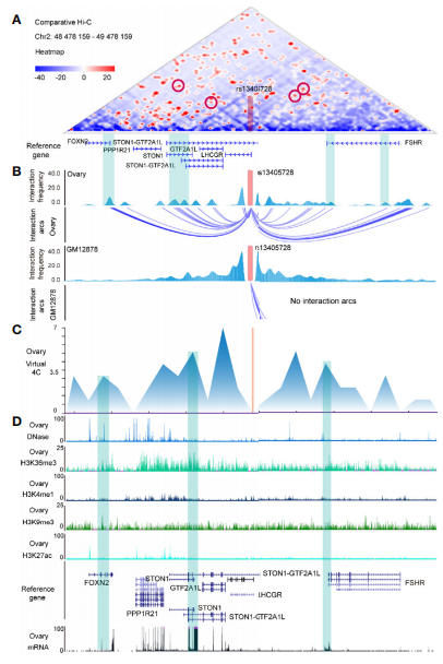 文章探索了卵巢組織的 Hi-C 相互作用并在卵巢組織和 GM12878(作為對照)之間進行了比較 Hi-C 圖(圖 1A),發(fā)現 FOXN2、STON1-GTF2A1L、STON1、GTF2A1L 和 FSHR是 rs13405728 (Chr2:48978158) 基因座的假定目標,在卵巢組織中具有相互作用(圖 1B)。