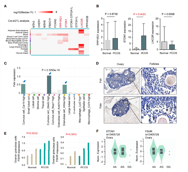 圖F 來自正常卵巢組織的 rs13405728 位點的 STON1 和 FSHR 的單組織 eQTL 分析。PCOS,多囊卵巢綜合征;eQTL,表達數量性狀基因座。