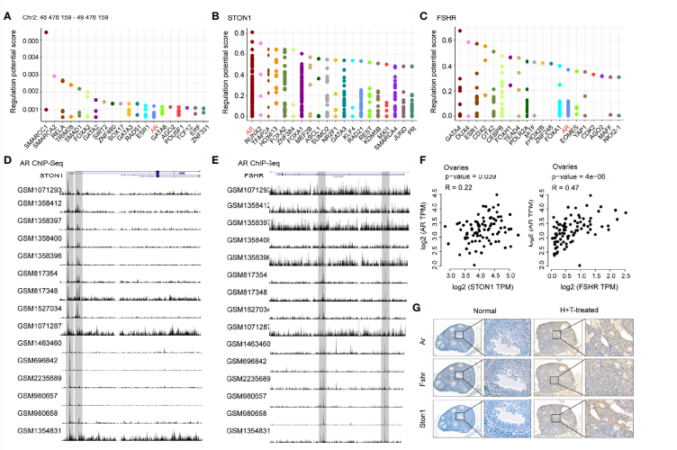 圖5. AR 被鑒定為 STON1 和 FSHR 的共同轉錄因子,并且與卵巢組織中 STON1 和 FSHR 的表達呈正相關