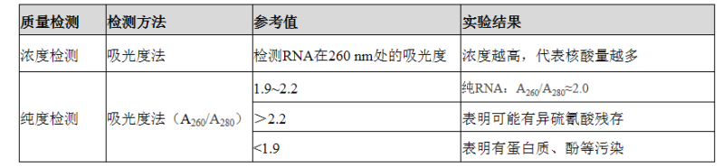 由于RNA具有共軛結(jié)構(gòu),可以吸收紫外光,故測(cè)定RNA溶液在260 nm的吸光度值,可計(jì)算出RNA的含量。其中純度高的RNA,A260/A280比值應(yīng)在1.9~2.2之間,若比值>2.2,表明可能有異硫氰酸,若比值<1.9,表明有蛋白質(zhì)、酚等污染;建議重新提取RNA。