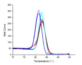 圖7:以1?μg不同物種的RNA為模板(紅色:人肝癌細(xì)胞;藍(lán)色:雞;黑色:斑馬魚;紫色:水稻種子;黃色:番茄果),用BiomarkerScript Ⅱ 1st Strand cDNA Synthesis Kit進(jìn)行逆轉(zhuǎn)錄,得到cDNA產(chǎn)物。再以100 ng不同物種的?cDNA為模板,用Biomarker?2×SYBR Green Fast qPCR Mix進(jìn)行qPCR擴(kuò)增。