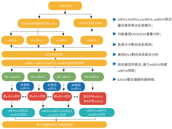 百邁客全轉錄組測序服務是一次檢測,獲得四種分子(mRNA、lncRNA、circRNA、miRNA)信息,針對不同類型的RNA進行表達分析,結構研究以及全新轉錄本的發(fā)現(xiàn),并結合競爭性內(nèi)源RNA(ceRNA)機制,進行聯(lián)合分析,深入挖掘轉錄水平調(diào)控網(wǎng)絡,深度探究各類RNA分子的調(diào)控機制。分析內(nèi)容如下: