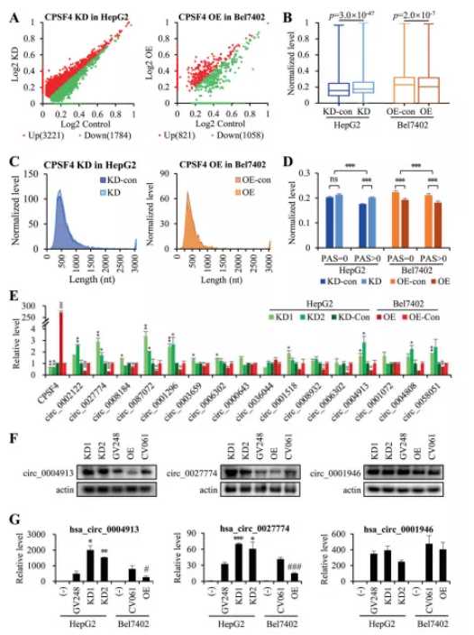 為了驗證,本研究首先從GEO數(shù)據(jù)庫中選擇了HCC組織中807個下調(diào)的circRNA(FC>2,p<0.05);然后從RNA-seq數(shù)據(jù)中篩選了1447個在CPSF4-OE細胞中下調(diào)或在CPSF4-KD細胞中上調(diào)的circRNA。這兩組數(shù)據(jù)取交集,共得到24個circRNA作為驗證的候選circRNA;結構分析表明其中16個含有PAS序列。實時PCR結果顯示,這16個circRNA中有13個在CPSF4-OE細胞中被抑制,但在CPSF4-KD細胞中被激活(圖 2E)。選擇2個帶有PAS元件的circRNA,hsa_circ_0027774 和 hsa_circ_0004913 作為CPSF4靶向的circRNA;同時,另一個廣泛研究的不含PAS元件的circRNA hsa_circ_0001946作為CPSF4非靶向circRNA。Northern blot結果表明hsa_circ_0027774和hsa_circ_0004913與CPSF4呈負相關,但hsa_circ_0001946在所有細胞系中保持相同水平(圖 2F)。同時構建了這三種circRNA的OE質粒并與CPSF4 OE或KD質粒共轉染,real-time PCR結果顯示帶有PAS的circRNA(hsa_circ_0027774和hsa_circ_0004913)與CPSF4水平呈負相關,而不含PAS的circRNA(hsa_circ_0027774和hsa_circ_0004913)不受CPSF4的影響(圖 2G),這說明CPSF4在轉錄后抑制了circRNA??傊珻PSF4直接調(diào)節(jié)HCC細胞中帶有PAS元件的circRNA的表達。