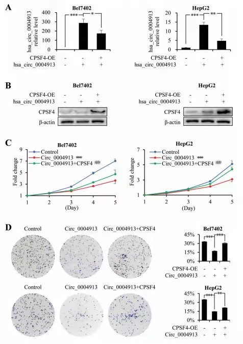 在Bel7402和HepG2細胞中生成hsa_circ_0004913-OE細胞,然后用CPSF4質粒轉染。分別通過蛋白質印跡和實時PCR檢測每個細胞系中的CPSF4蛋白和hsa_circ_0004913表達水平(圖 4A,B)。與對照細胞相比,hsa_circ_0004913-OE細胞顯示出較慢的增殖和較低的克隆形成。然而,CPSF4的OE可以消除hsa_circ_0004913的腫瘤抑制作用,因為CPSF4轉染后生長速度和克隆形成能力恢復(圖 4C,D)。這些結果表明circRNA在CPSF4介導的HCC細胞腫瘤發(fā)生中的重要作用。