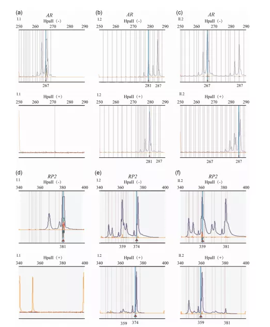 作者進行了基于PCR的AR和RP2分析,以評估外周血中的XCI模式。使用甲基化敏感的限制性內(nèi)切酶HpaII,使PCR只擴增非活性X染色體上的等位基因。通過分離分析確定了失活X染色體的起源。