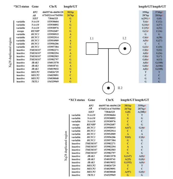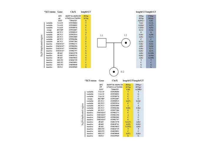 II.2的未消化PCR產(chǎn)物給出了每個標記的兩個峰(AR為267/287,RP2為359/381)。HPAII消化產(chǎn)物(圖2c和2f)觀察到一個代表287個AR(359個RP2)的主峰,這表明失活等位基因遺傳自I.2。對I.2的未消化PCR產(chǎn)物的分析給出了兩個峰(AR為281/287,RP2為359/374)。通過分析HpaII消化產(chǎn)物(圖2b和2e)檢測到的主峰(AR為281,RP2為374)與II.2失活產(chǎn)物等位基因中的主峰不同。這些結果表明,在母親II.2和祖母I.2中發(fā)現(xiàn)了XCI的極端傾斜,這與失活X染色體不同(圖2)。AR PCR產(chǎn)物的287 bp峰值、II.2中RP2 PCR產(chǎn)物的359 bp峰值以及Xq28重復來自祖母I.2,它們與相同的X染色體相連。然而,該等位基因在AR PCR后峰值為287 bp,RP2 PCR后峰值為359 bp,Xq28重復,在II.2中失活,但在I.2中激活。