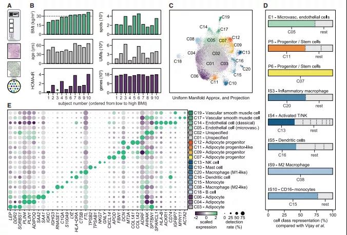 作者使用10x Genomics Visium平臺(tái)對(duì)?WAT中的細(xì)胞類(lèi)型的異質(zhì)性和空間位置進(jìn)行了研究。通過(guò)穿刺活檢獲得體重指數(shù)、年齡和對(duì)胰島素敏感性均有差異的10個(gè)人的腹部皮下WAT樣本。對(duì)其覆蓋27,937個(gè)spots的數(shù)據(jù)進(jìn)行空間轉(zhuǎn)錄組分析,結(jié)果發(fā)現(xiàn)每個(gè)切片平均檢測(cè)17,303個(gè)獨(dú)特基因和3,280,607個(gè)UMIs(圖1B)。通過(guò)對(duì)數(shù)據(jù)進(jìn)一步分析,共鑒定了?20種不同的細(xì)胞類(lèi)群(C01-C20;圖1C),且存在于所有捐助者中。接下來(lái),將目前的結(jié)果與最近發(fā)表的人類(lèi)WAT間質(zhì)血管的單細(xì)胞數(shù)據(jù)進(jìn)行整合分析?,結(jié)果表明,空間數(shù)據(jù)包含了內(nèi)皮細(xì)胞、免疫細(xì)胞和祖細(xì)胞的特定群體(圖1D)。人工注釋標(biāo)記基因協(xié)助作者對(duì)20類(lèi)細(xì)胞類(lèi)型進(jìn)行標(biāo)注(圖1E),主要包括免疫細(xì)胞(單核細(xì)胞[C15], Ml-like[C20]和 M2-like 巨噬細(xì)胞[C08],樹(shù)突細(xì)胞[C16],肥大細(xì)胞[C10], B細(xì)胞[C18]和NK細(xì)胞[C13]),血管細(xì)胞(微血管 [C05]和經(jīng)典[C14]內(nèi)皮細(xì)胞和血管平滑肌細(xì)胞[C17 / C19])和脂肪細(xì)胞祖細(xì)胞(C07 / C09 / C12)。在后者中,C07表達(dá)成熟的前脂肪細(xì)胞/脂肪干細(xì)胞標(biāo)記物,C09表達(dá)編碼纖維化和細(xì)胞外基質(zhì)蛋白的轉(zhuǎn)錄本,而C12是前兩者的混合。一個(gè)祖細(xì)胞類(lèi)群(C11)富集了多個(gè)編碼金屬硫蛋白的基因,在立體分析中將其歸為祖細(xì)胞(圖1D)。然而,在UMAP中,它從其他三個(gè)祖細(xì)胞中分離出來(lái),因此,作者確定了其特征基因在脂肪生成的整體轉(zhuǎn)錄譜和WAT的不同組分中的表達(dá)。這些分析證實(shí)了C11在脂肪祖細(xì)胞中富集,并在人類(lèi)脂肪形成過(guò)程中瞬時(shí)表達(dá)。