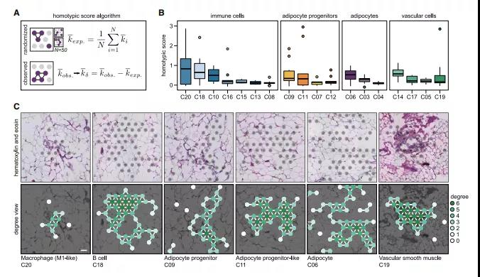 ? ? ? ?為了確定不同細(xì)胞類(lèi)型之間的空間關(guān)系,作者還開(kāi)發(fā)了一種算法對(duì)異型鄰域分析 (圖3A),揭示了幾種關(guān)聯(lián)性(圖3B,3C)。正如預(yù)期的那樣,較大血管結(jié)構(gòu) (C14/C17/C19)彼此之間的距離比與血管樣組織的距離更加靠近;M2-like巨噬細(xì)胞(C08)經(jīng)常位于兩種脂肪祖細(xì)胞附近:C09的同型簇(圖3C)和分散的C12,這與小鼠研究一致。此外,樹(shù)突狀細(xì)胞(C16)與其他免疫細(xì)胞表現(xiàn)出較高的異型評(píng)分,而兩類(lèi)成熟脂肪細(xì)胞(C03/C04)相互共定位,并與C06脂肪細(xì)胞明顯分離??傊?,異型鄰域分析表明,WAT的空間定義比預(yù)期的更明確,具有特定的細(xì)胞-細(xì)胞關(guān)系。