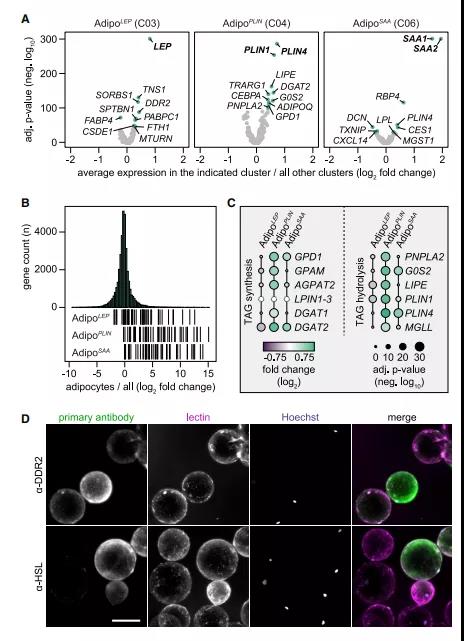 ? ? ? ? ? ?作者的分析確定了三種不同類(lèi)型的成熟脂肪細(xì)胞,它們具有不同的轉(zhuǎn)錄譜和空間排列。作者進(jìn)一步定義了每個(gè)亞型的標(biāo)記基因(圖4A),結(jié)果發(fā)現(xiàn)了LEP(編碼脂肪因子瘦素)、PLIN1/PLIN4(編碼脂滴蛋白perilipin-1和-4)和SAA1/SAA2(編碼血清淀粉樣蛋白A1和A2急性期蛋白質(zhì))是各分類(lèi)中最獨(dú)特的基因。因此,作者將這些亞群體命名為Adipo LEP、Adipo PLIN和Adipo SAA。如結(jié)果所示,Adipo LEP富集了細(xì)胞-細(xì)胞/基質(zhì)細(xì)胞相互作用蛋白和瘦素信號(hào)/分泌調(diào)節(jié)基因。AdipoPLIN標(biāo)記基因與葡萄糖和脂質(zhì)代謝以及脂肪因子脂聯(lián)素相關(guān)。雖然Adipo SAA與Adipo PLIN有一些共同的標(biāo)記基因,但這類(lèi)基因也富集了多種與視黃醇代謝及結(jié)合的多種脂肪因子和酶。為了證實(shí)這三種亞型的標(biāo)記基因在成熟脂肪細(xì)胞中表達(dá),作者分析了大量配對(duì)樣本的轉(zhuǎn)錄組學(xué)數(shù)據(jù),比較了從WAT中分離的脂肪細(xì)胞和非脂肪細(xì)胞。相關(guān)數(shù)據(jù)表明,50個(gè)標(biāo)記基因在脂肪細(xì)胞中富集(圖4B),說(shuō)明Adipo LEP、AdipPLIN和AdipoSAA代表不同類(lèi)型的脂肪細(xì)胞??臻g數(shù)據(jù)的進(jìn)一步分析顯示,這些亞型表現(xiàn)出相互的表達(dá)模式(圖4C)。作者用針對(duì)AdipoLEP(DDR2)和Adipo PLIN (HSL,由LIPE編碼)標(biāo)記蛋白的抗體對(duì)從人皮下WAT分離的成熟脂肪細(xì)胞進(jìn)行染色,驗(yàn)證了該結(jié)果(圖4D)。此外,還使用針對(duì)CD36(Adipo PLIN的標(biāo)記物)和 CSDEl(Adipo LEP的標(biāo)記物)的抗體對(duì)人類(lèi)成熟脂肪細(xì)胞進(jìn)行了免疫共標(biāo)記,觀察到其相互的染色模式。對(duì)于Adipo SAA,作者進(jìn)行了多種抗體的測(cè)試,但沒(méi)有一種抗體顯示出足夠的特異性。綜上所述,空間數(shù)據(jù)可在蛋白質(zhì)水平上進(jìn)行概述,并支持所鑒定的脂肪細(xì)胞具有不同表達(dá)譜的亞群。